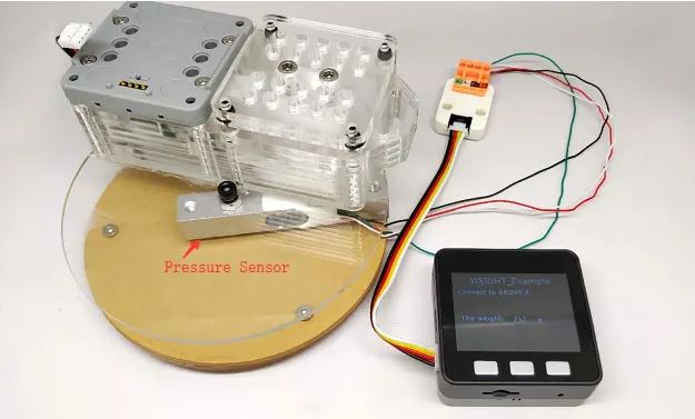 WEIGHT 是一款計重Unit,集成專為高精度電子秤而設計的24位A/D轉換器晶片HX711,輸入選擇開關可任意選取通道A 或通道B,與其內部的低噪聲可編程放大器(PGA )相連,通道A 的可編程增益為128 或64,對應的滿額度差分輸入信號幅值分別為±20mV或±40mV.通道B 則為固定的32 增益,所有控制信號由管腳驅動,無需對晶片內部的寄存器編程.在測試中,我們將使用WEIGHT Unit 連接壓力感測器,並通過M5Core顯示重量測量數據。