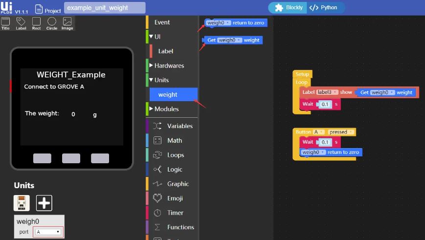 該案例使用10Kg量程的感測器.(單位:克)2.UIFlow