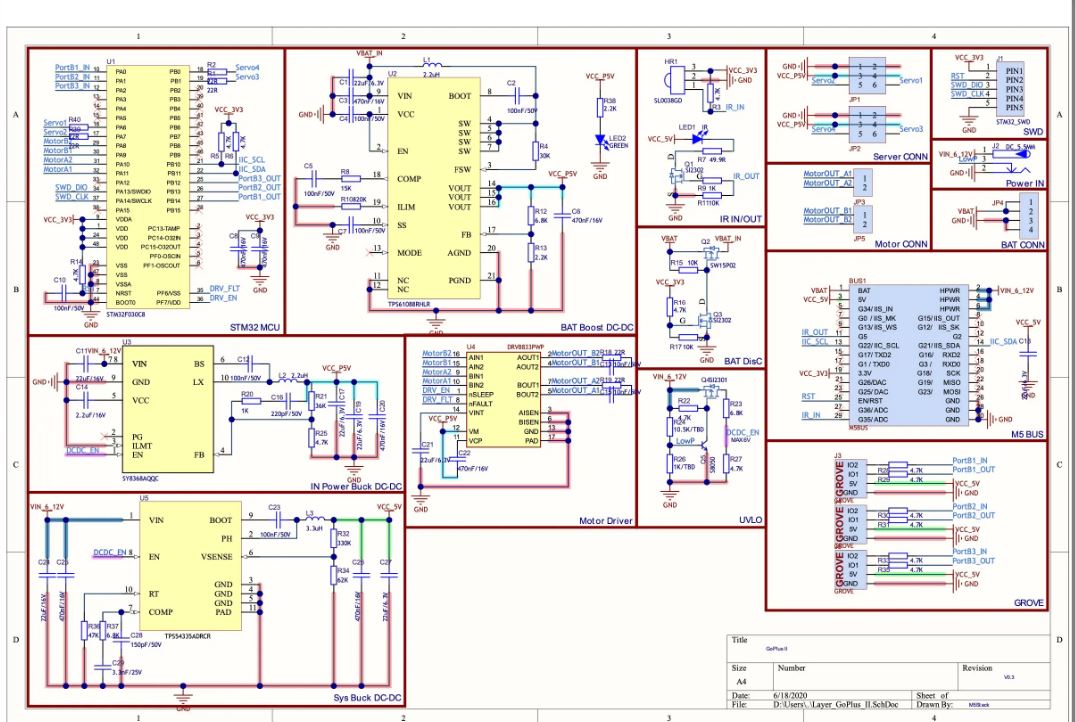 GoPlus2 是一款可堆疊的多功能電機舵機控制模組。下位機採用STM32F030C8T6,模組配備2路直流電機驅動接口,4路舵機驅動接口,可擴展3個PORT-B接口,滿足模擬輸入、數字輸入輸出的需求,同時支持紅外(IR)發射與接收。模組提供一個DC直流電源接口用於外部供電,此外模組內部有500mAh電池,可通過M5Core主機對其充電。