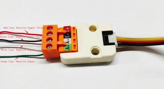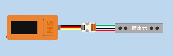 StickC 透過Grove傳輸線連接上Weight unit ,荷重元的接線 : 供電(紅)、接地(黑)、訊號INNA(灰/白)、訊號INPA(綠)。