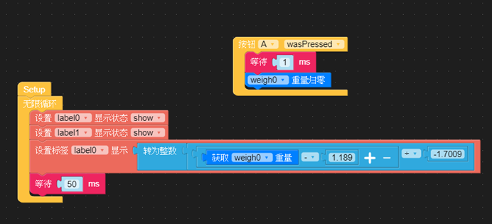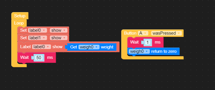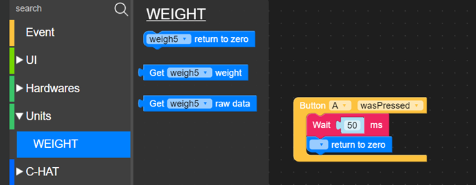 市售的電子秤都會配有扣重功能,目的是針對不同的容器進行歸零校正,歸零是電子秤非常重要的功能之一,透過UiFlow Weight units 函式庫加入這個功能,並設計當按下「Button A」時歸零