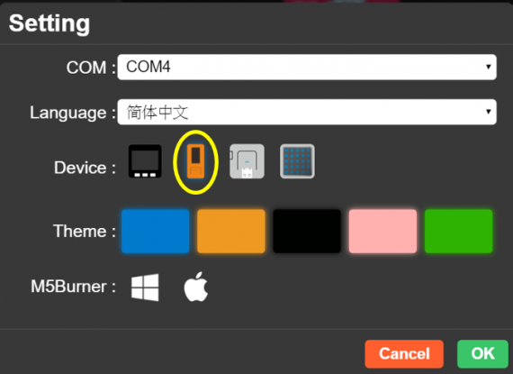 本次實作使用M5Stack UiFlow進行開發,將StickC 透過TYPE-C傳輸線接上電腦(確認電腦已經安裝USB驅動,正確安裝USB驅動後電腦會自動識別COM port並顯示在COM欄位),連接後開啟UiFlow,並選擇StickC Core,按下「OK」確認。