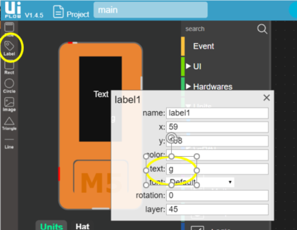 接下來規劃畫面上要顯示的文字,電子秤上必須顯示重量值以及重量單位,使用UiFlow內建的拖拉式介面建立文字標籤,由於本次實作的荷重元選用的是5公斤(KG),重量的單位這裡選用公克(g),設定其中一個標籤固定印出 「g」,另一標籤印出重量讀取值。