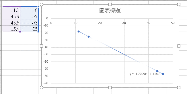 執行程式後,將砝碼或是已知重量的物體放上電子秤,數值因為沒有經過修正存在極大的誤差,必須校正進行換算,首先使用EXCEL表格化不同物體實際重量與顯示重量,接下來製作散佈圖,圖中任一點點選右鍵選擇趨勢線,並選擇線性、在圖表上顯示方程式。