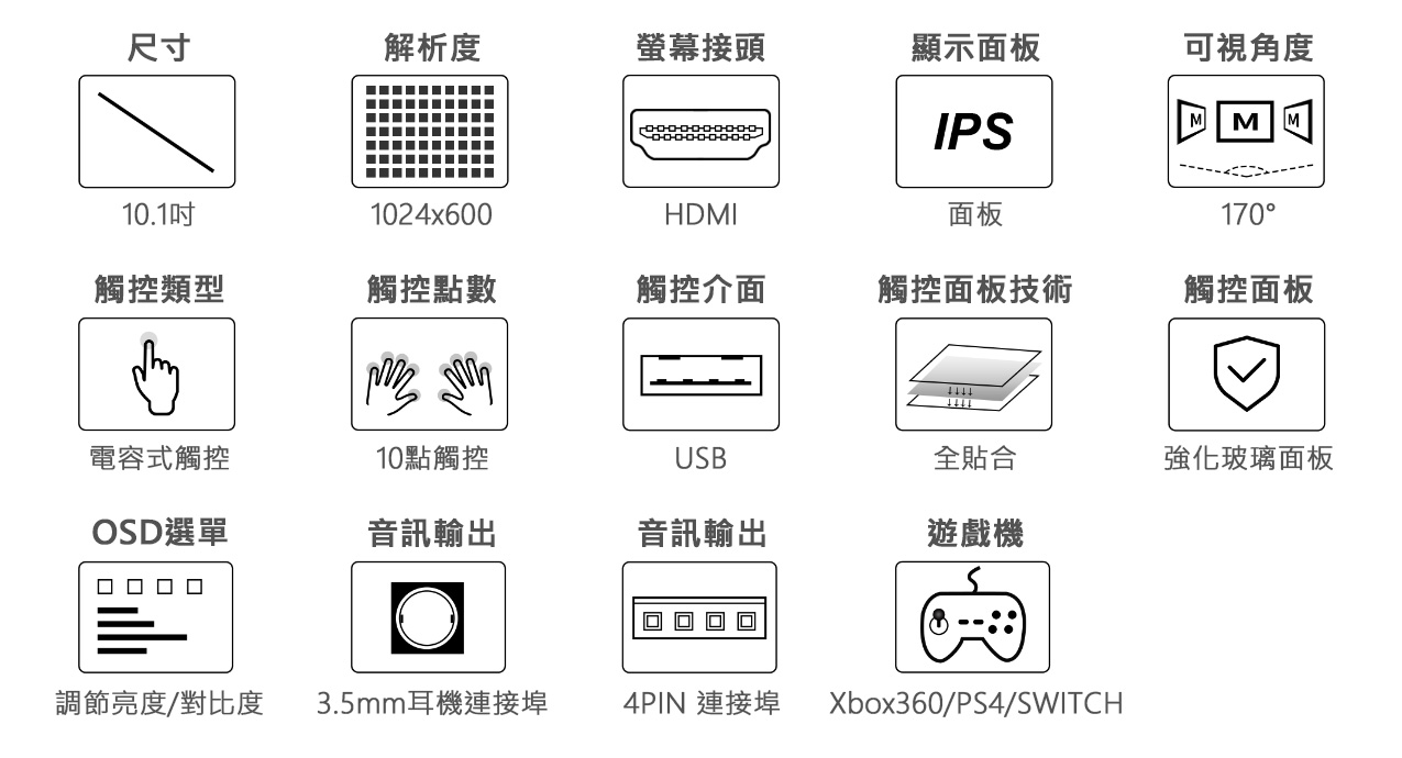 | 10.1HP-CAPQLED | 1280x720 | HDMI | IPS(QLED) | 170° | 電容 | USB | 鋼化玻璃 | - | - | V | V | V | V |