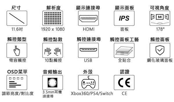 | 15.6inch FHD Monitor | 1920x1080 | HDMI Type-C | IPS | 178° | 電容 | Type-C USB | 鋼化玻璃 | - | V | V | V | V | V |