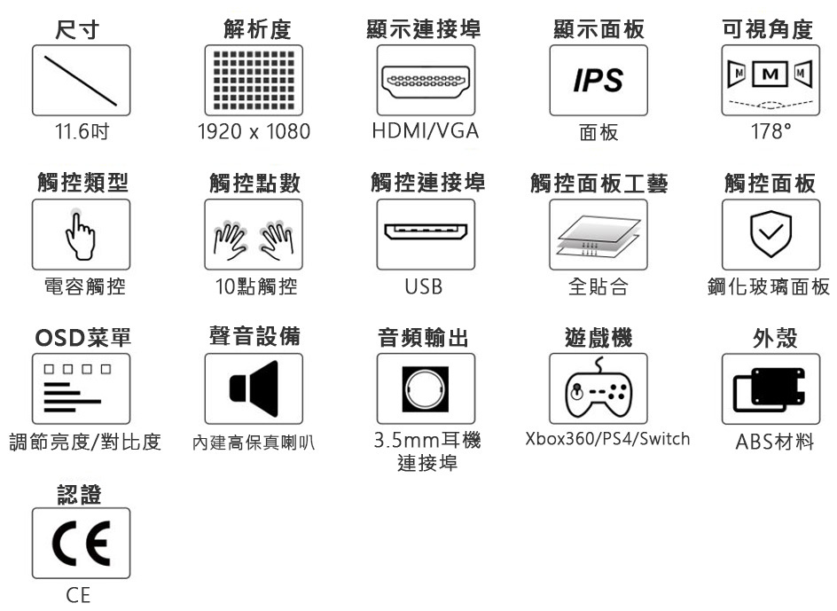 | 15.6inch FHD Monitor | 1920x1080 | HDMI Type-C | IPS | 178° | 電容 | Type-C USB | 鋼化玻璃 | - | V | V | V | V | V |