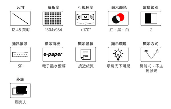 功耗低、視角寬、斷電仍可清晰顯示。適用於貨架標籤、工業儀表等顯示應用。