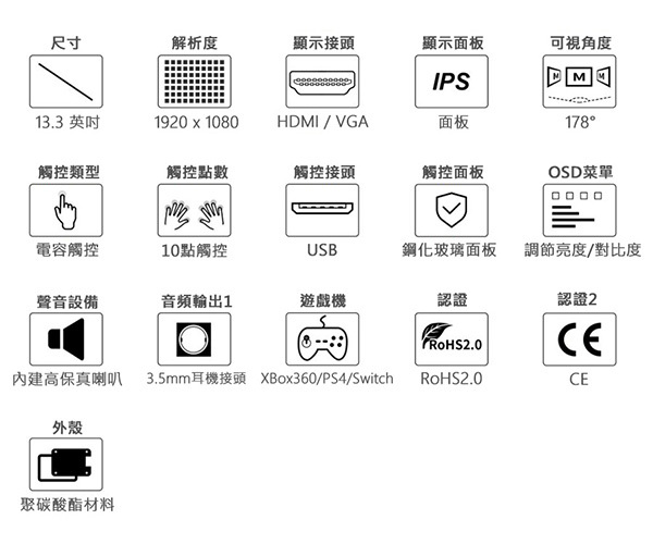 | 15.6inch FHD Monitor | 1920x1080 | HDMI Type-C | IPS | 178° | 電容 | Type-C USB | 鋼化玻璃 | - | V | V | V | V | V |