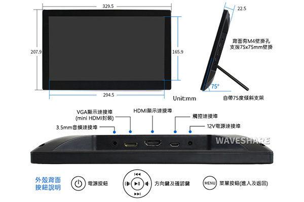 | 13.3inch HDMI LCD (H) (帶外殼) | 1920x1080 | HDMI VGA | IPS | 178° | 電容 | USB | 鋼化玻璃 | - | V | V | V | V | V |