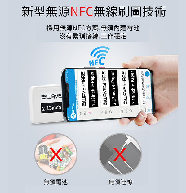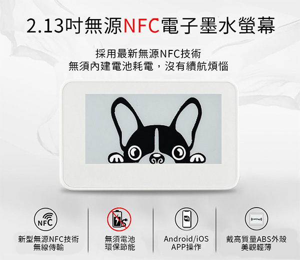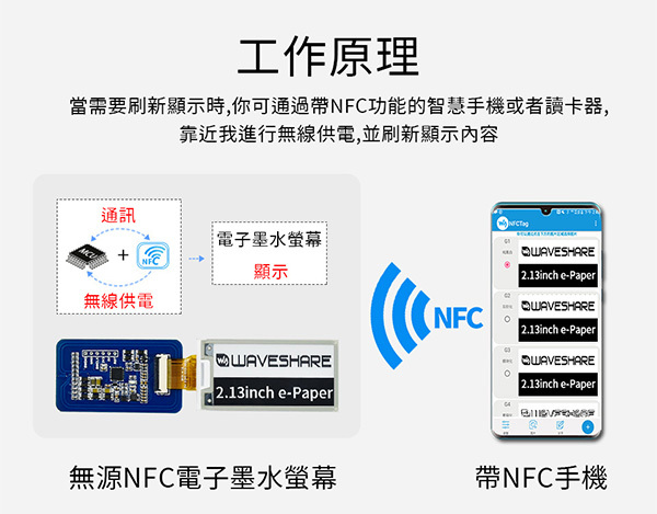 2.13 吋 NFC 電子墨水螢幕 採用黑白高解析度顯示,通過 NFC 技術無線更新內容,無需電池供電。適用於電子貨架標籤、智能標牌和物聯網應用,提供低功耗和穩定的顯示解決方案。