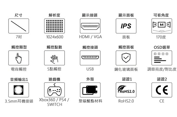 | 解析度 | 顯示介面 | 顯示面板 | 可視角度 | 觸控 類型 | 觸控 介面 | 觸控 面板 | 全貼合 工藝 | 喇叭 | 訊號 輸出 | 樹莓派 | Jetson Nano | 電腦 | |