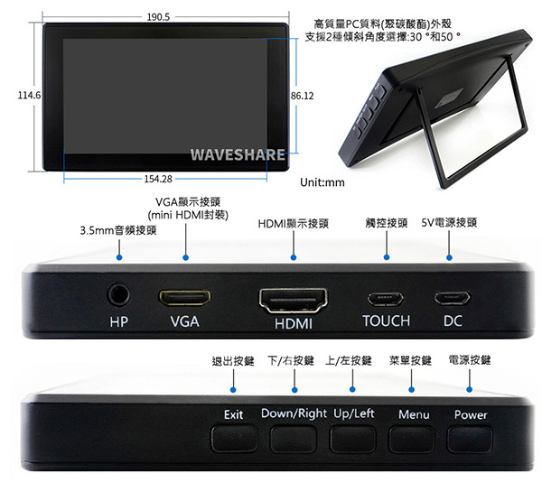 | 7inch HDMI LCD (H) (帶外殼) | 1024x600 | HDMI VGA | IPS | 170° | 電容 | USB | 鋼化玻璃 | - | - | V | V | V | V |
