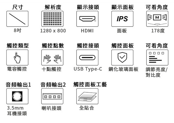 8吋高畫質全貼合觸控屏 1280×800像素強化玻璃面板HDMI介面IPS顯示螢幕