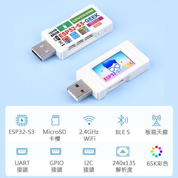 ESP32-S3-GEEK 是一款微雪(Waveshare) 為極客設計的開發板,板載USB-A 公頭、1.14 吋LCD 螢幕、Micro SD 卡槽等外設,支援2.4GHz WiFi 和BLE 5, 整合16MB Flash 和2MB PSRAM,提供I2C 接口、UART 接口和GPIO 接頭,可以為你的專案提供更多可能。