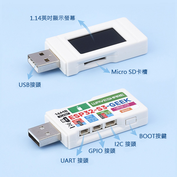 微雪ESP32-S3極客開發板 搭載ESP32-S3R2控制晶片 1.14吋65K彩色LCD 支援WiFi和低功耗藍牙 USB-A公頭 帶白色塑膠外殼