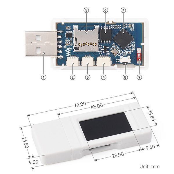 適用於基於 ESP32-S3 的無線隨身硬碟盤,USB WiFi/藍牙,USB Dongle 等創意應用,以及學生入門編程學習等使用場景