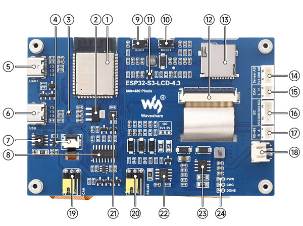 | 9 | BOOT 按鍵 按住上電進行程序燒錄 | 21 | CH343P USB 轉 UART 晶片 |
