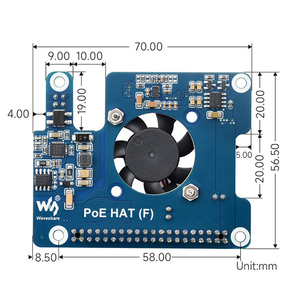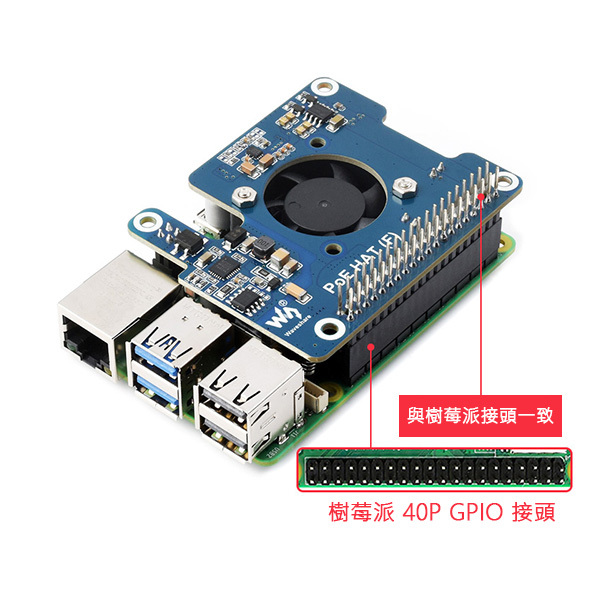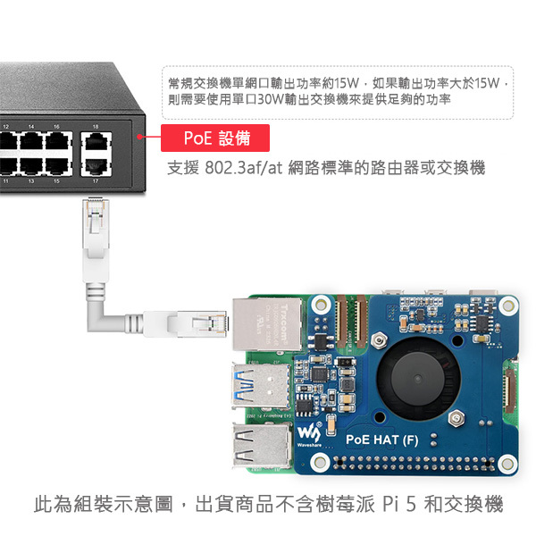 一款適用於 Raspberry Pi 5 的乙太網路供電 (PoE) 擴充板,支援 IEEE 802.3af/at 網路標準。適合搭配支援 IEEE 802.3af/at 網路標準的 PoE 路由器或交換器一起使用,只需一條網路線接取即可讓樹莓派進行連網和供電。