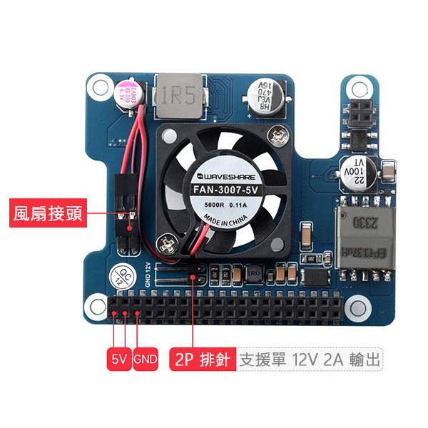 板載 5V 和 12V 排針接口,5V 接口總功率可高達 4.5A 輸出能力 (12V 和 5V 輸出總功率不超過 25W),滿足樹莓派供電的同時還能給額外設備供電