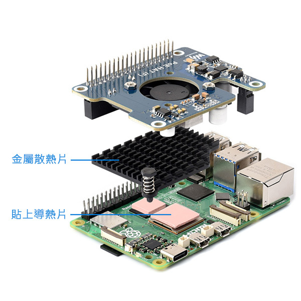 先貼上導熱貼,再裝上金屬散熱片,再裝上 PoE 擴充板即可