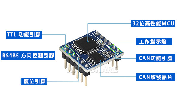 本產品為體積小巧,易整合的串口轉 CAN 模組,板載高效能 MCU,自備 TTL 和 CAN 轉換協議,只需簡單配置即可實現串口轉 CAN 功能。