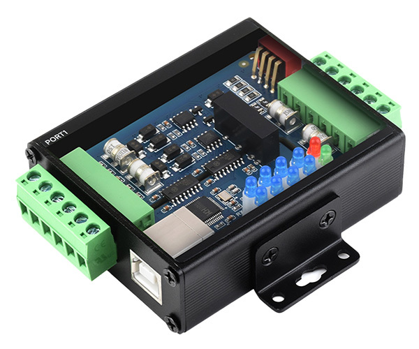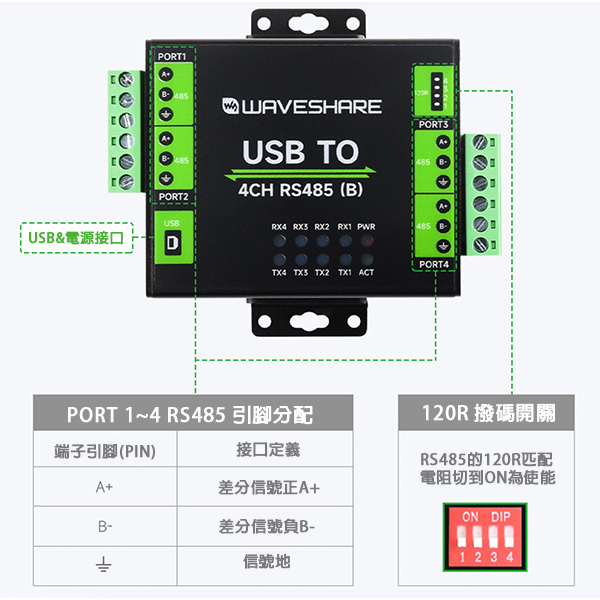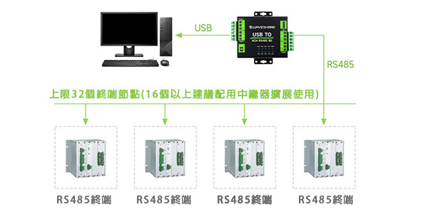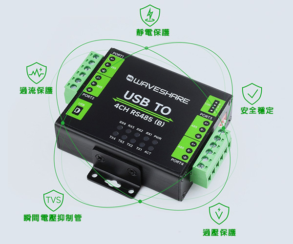 可將 USB 訊號轉換成 4 個平衡差分 RS485 訊號,傳輸速率穩定,可靠速度為 1200~460800bps,傳輸距離 RS485 約 1200 米,USB 約 5 米