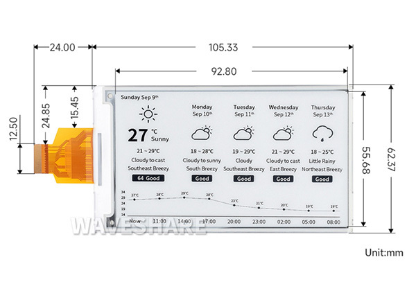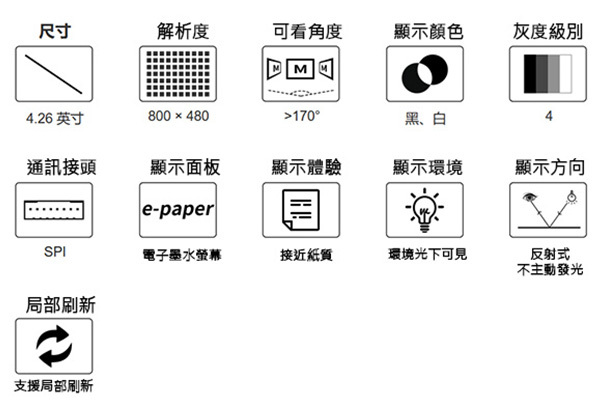 黑白、灰階4,支援局部刷新,功耗低、視角寬、斷電仍可清楚顯示