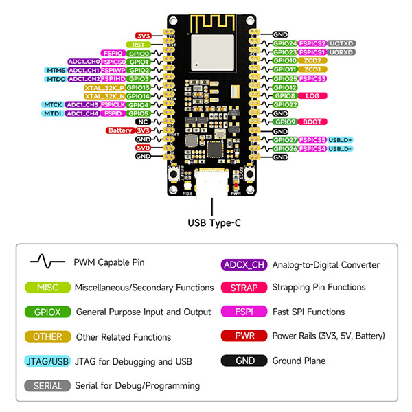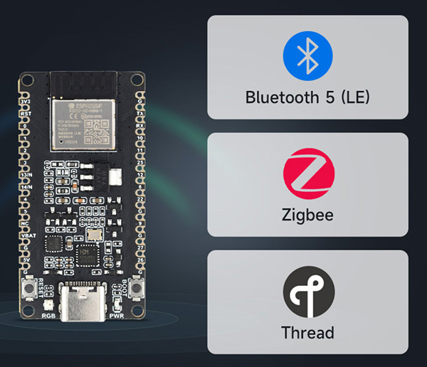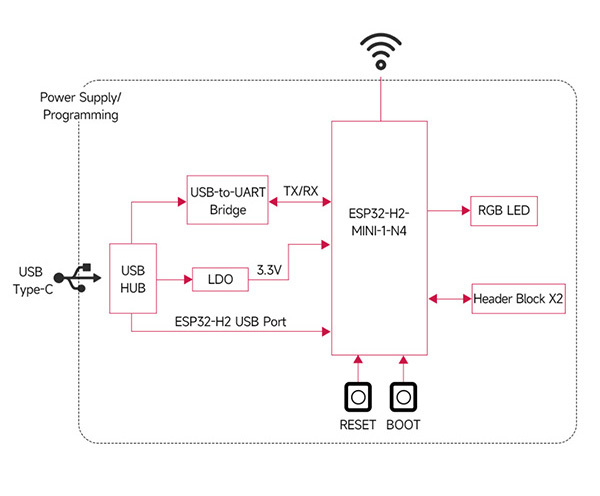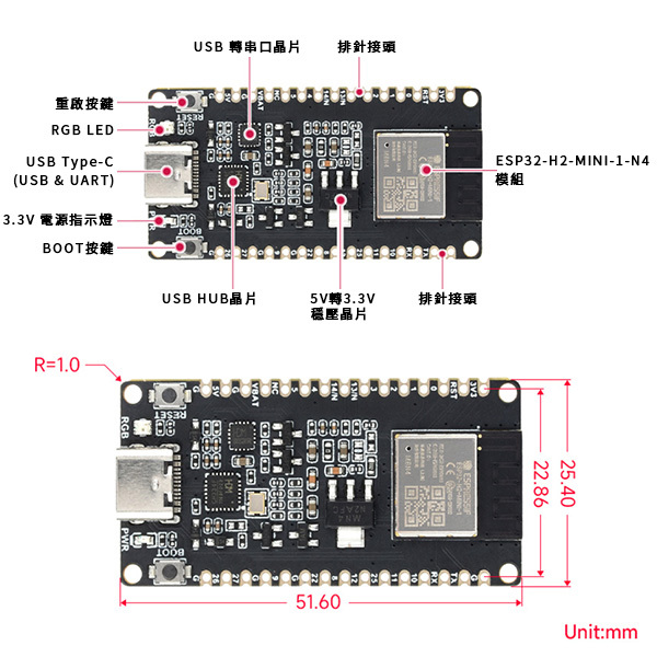 在硬體上,採用ESP32-H2-MINI-1-N4 模組,其搭載有RISC-V 32 位元單核心處理器, 支援高達96MHz 主頻,內建4MB Flash,整合了豐富的周邊,包括SPI、 UART、I2C、I2S、LED PWM、ADC 等介面;也板載CH343 串列埠和CH334 USB HUB 雙晶片,可透過一個USB-C 介面進行USB 和UART 使用和開發,接腳介面相容於ESP32-H2-DevKitM- 1 開發板,可相容於擴充多種週邊設備,使用更方便。