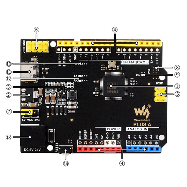 | 6 | 電源輸出介面 可透過電源配置開關輸出 3.3V 或 5V,常用於對外供電或進行共地處理 | 13 | DC 電源介面 可接入 6V~24V 範圍內電壓 |