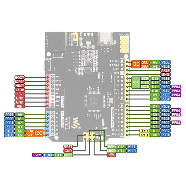| 4 | Arduino 介面 相容於 Arduino 接口,側邊引出 2.54 間距排針焊盤,可直接插入萬用板 | 11 | USB Type-C 介面 用於下載程式與串列埠調試 |