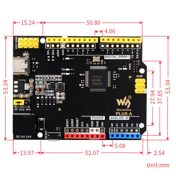 工作電壓5V/3.3V可選,板載Arduino介面、ICSP介面、SWD介面、USB Type-C介面、電源輸出介面等