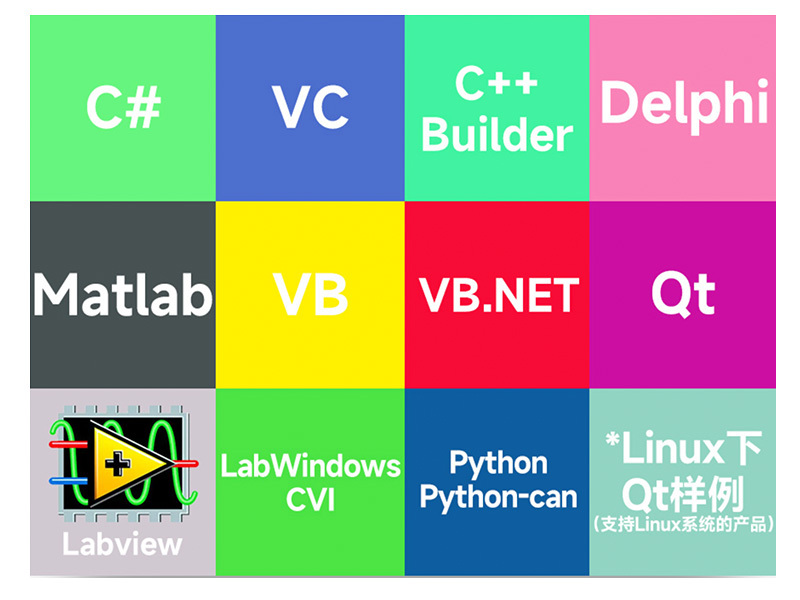提供各種主流開發平台二次開發工程範例原始程式碼:C++Builder、C#、VC、VB、VB.NET、Delphi、LabVIEW、LabWindows/CVI、Qt、Matlab、Python/Python-can、Linux 下 Qt 範例