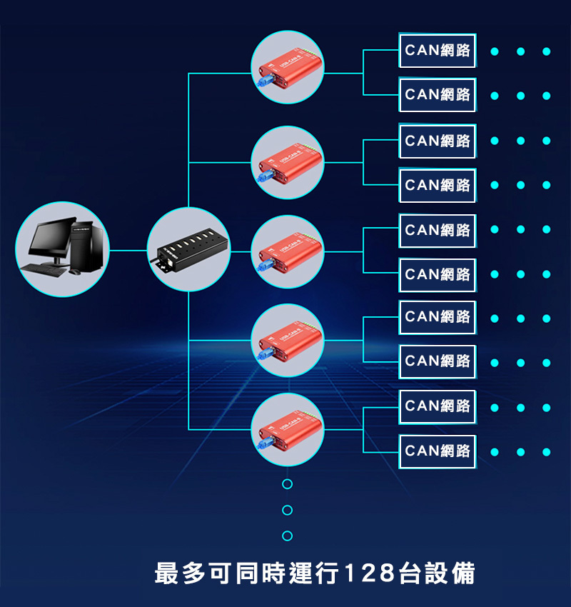 一台電腦可同時運行多個 CAN 分析儀,全部獨立運作互不干擾,經過測試至多可運行 128 台設備;適用於一台監控設備需要同時監控多個 CAN 網絡,或者可靠性要求數據對比較驗時等場合