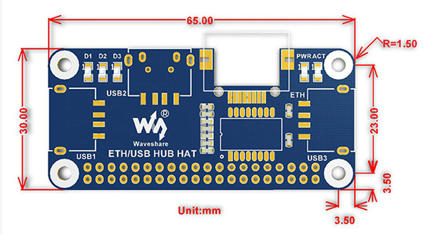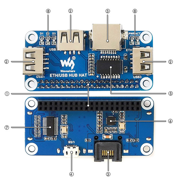 整合乙太網路和USB集線器功能的樹莓派擴充板,擴充了1個RJ45網路埠和3個USB埠。