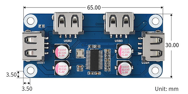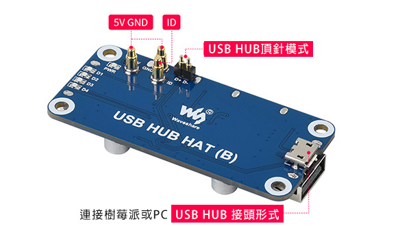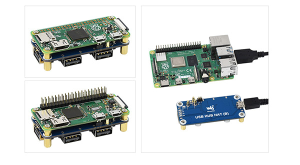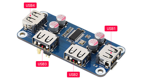 USB HUB HAT (B) 是適用於 Raspberry Pi 的 USB HUB 擴充板,可擴充 4 路 USB 2.0 介面。頂針式設計,特別適合用在 Zero 系列主機板上,還支援透過連接線連接到其他樹莓派主機板或 PC 機上,再也不擔心 USB 介面不夠用了。