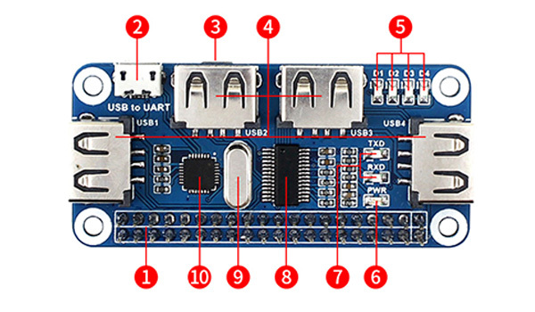 | (3)USB HUB 接口(背面) | (7)USB to UART 狀態指示燈 |