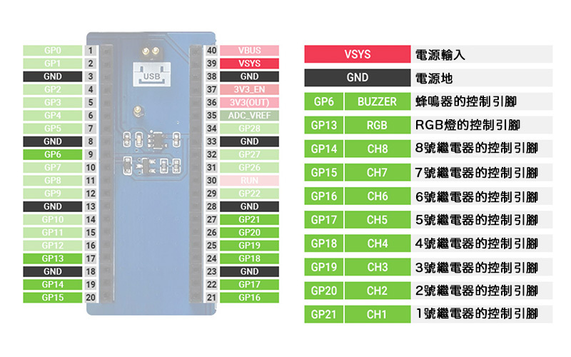 | 1 | Raspberry Pi Pico 接口 | 9 | 電源指示燈 |