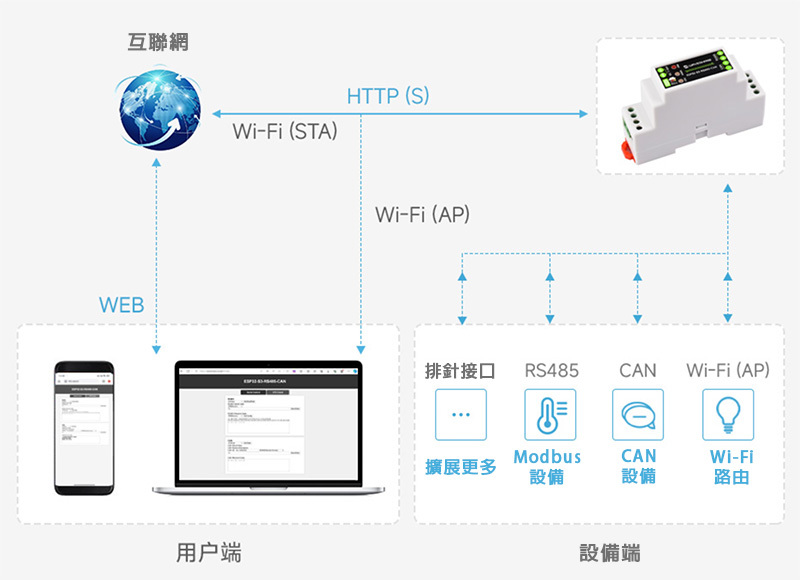 可實現使用手機或電腦瀏覽器進入相關網頁控制設備發送數據