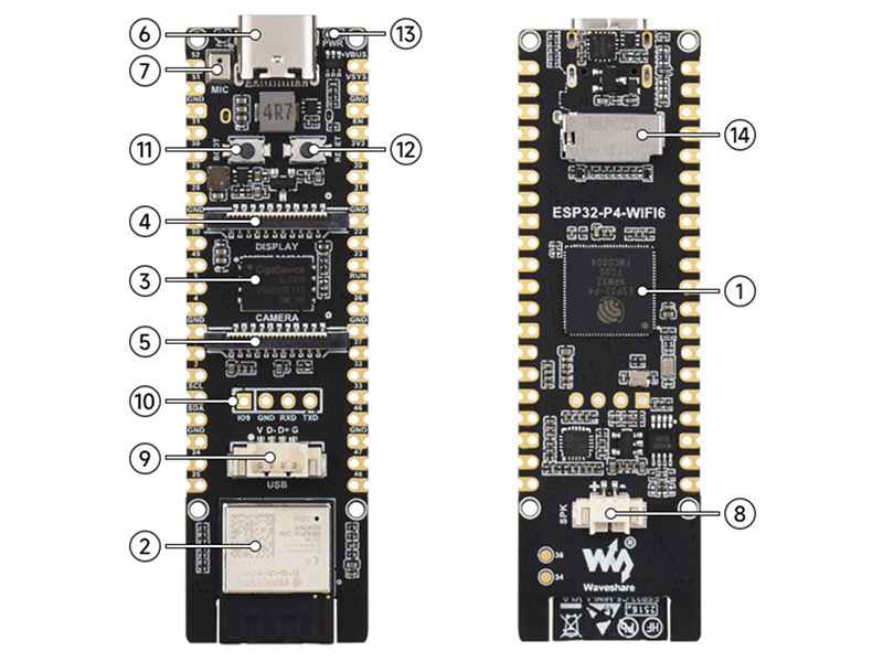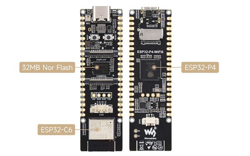 開發板採用 ESP32-P4 模組,板載 ESP32-C6、32MB Nor Flash