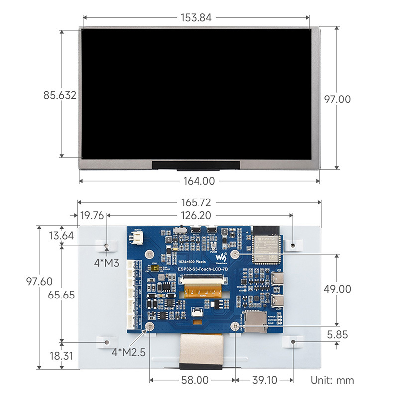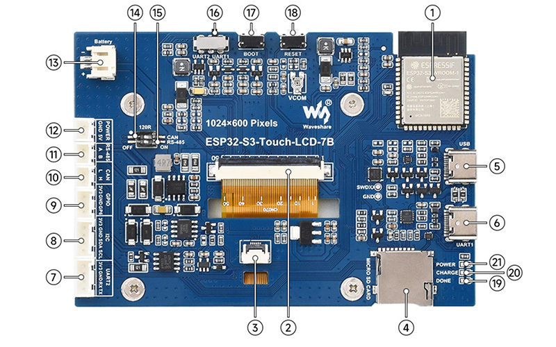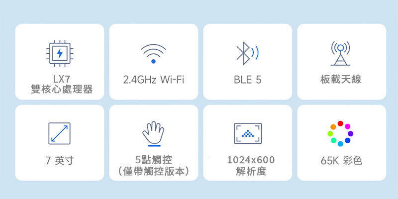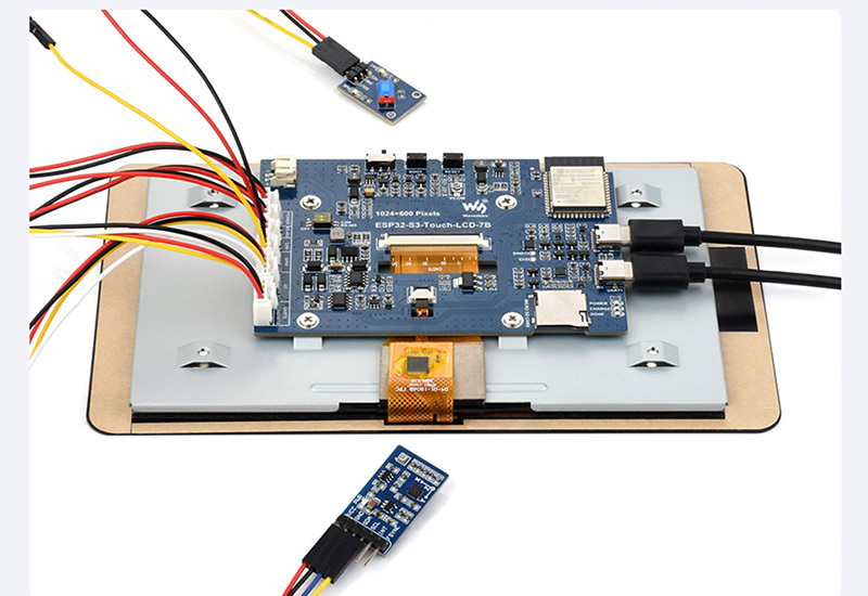 本產品為支援 2.4GHz Wi-Fi 和 BLE 5 的微控制器開發板。整合大容量 Flash 和 PSRAM,板載 7 吋 LCD 屏,可流暢運行 LVGL 等 GUI 介面程序,結合多種週邊接口,可快速開發 ESP32-S3 的 HMI 等應用。