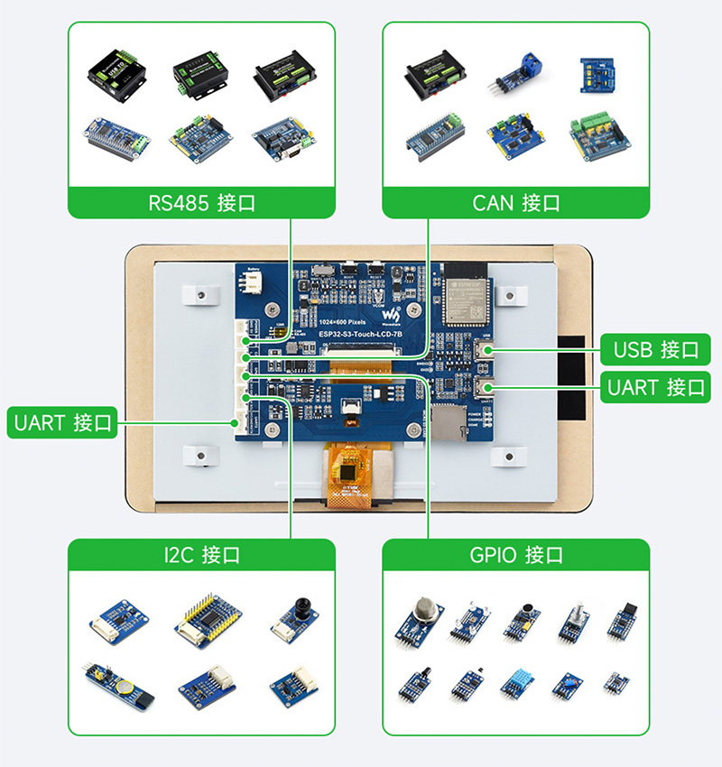 內建512KB SRAM和384KB ROM,疊封16MB Flash和8MB PSRAM,板載CAN、RS485等介面及 Micro SD 卡座