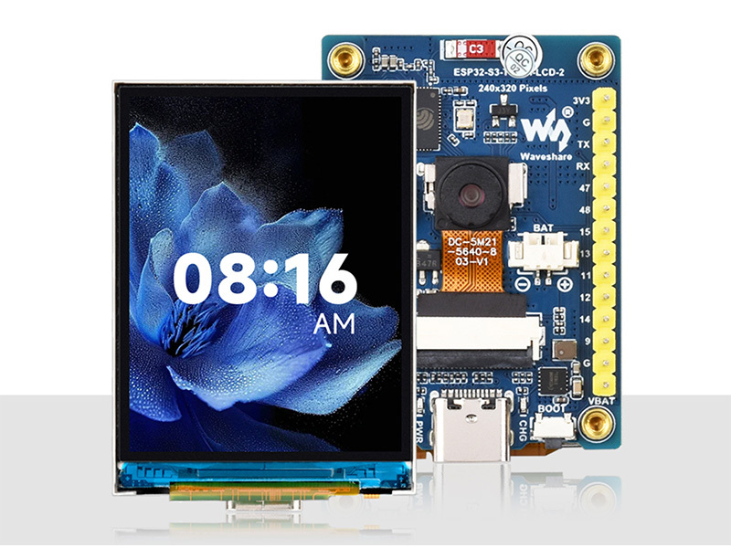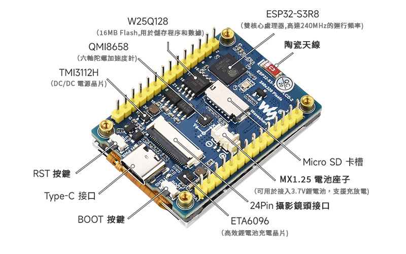 本產品是一款由微雪 (Waveshare) 設計的低成本、高效能的微控制器開發板。在較小的板型下,板載了 2 吋 LCD 螢幕、鋰電池充電晶片、六軸感應器 (三軸加速度計與三軸陀螺儀)、相機介面等外設,方便開發並嵌入應用到產品中。