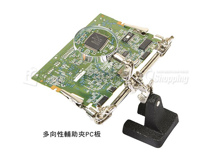 採用鑄鋼底座、穩固耐用、堅實。多向性輔助夾PC板大小長短、方可變換均無障礙。配合3倍壓克力鏡片, 可用於SMD電路。