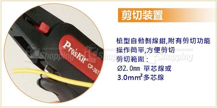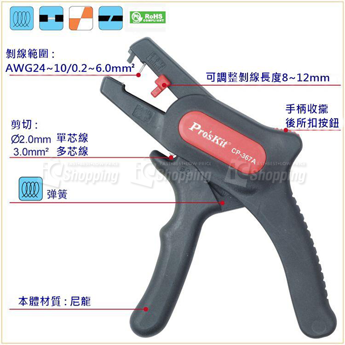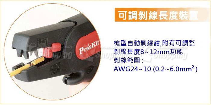自動調整機制,根據線材規格調整剝線,不傷線芯。剝線能力 10-24AWG(/0.2~6.0mm2)可調整剝線長度8-12mm。容易操作使用的內建式側邊剪切。最大可剪切2mm線徑線材。剝線刀片及剪切刀片均使用SK5鋼材。狹長頭型設計,方便於特定的空間使用。安全鎖定功能,方便收納。