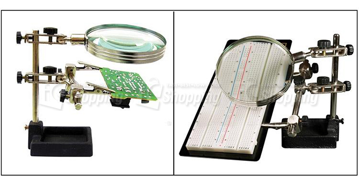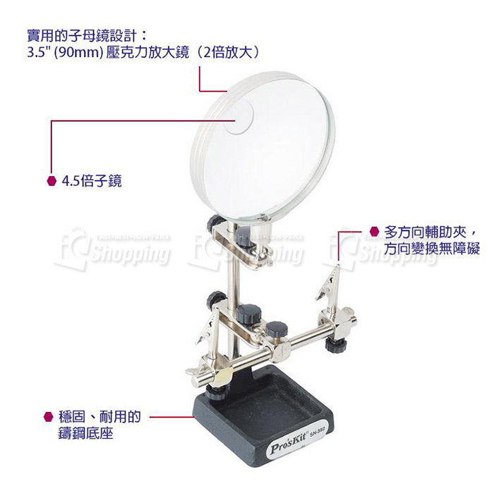 可廣泛使用於工業電子、實驗室珠寶等領域上。穩固、耐用的鑄鋼底座。多方向輔助夾,方向變換無障礙。實用的子母鏡設計:3.5" (90mm) 壓克力放大鏡(2.5倍放大)搭配4.5倍子鏡。非常適合焊接與細節處理的精密作業。