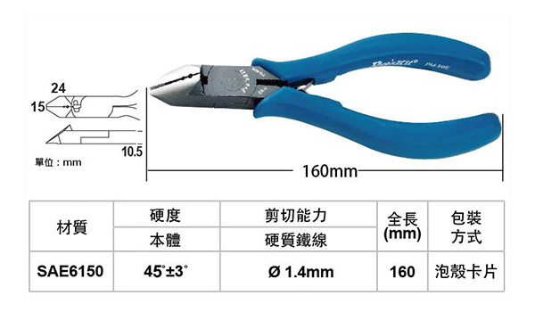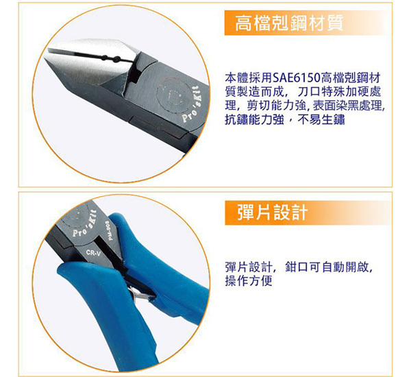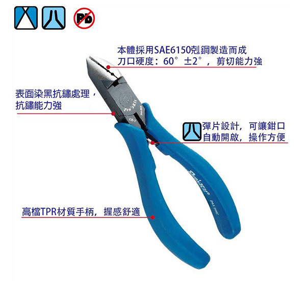 PM-908 剋鋼6吋斜口鉗,雙金屬合成。刀口銳利、 耐剪切,適合電工配線、機械、土木裝修人員使用。偏芯設計,操作更省力。PVC防滑握柄,好拿不脫落。鉗口水平齒設計,夾持效果佳。