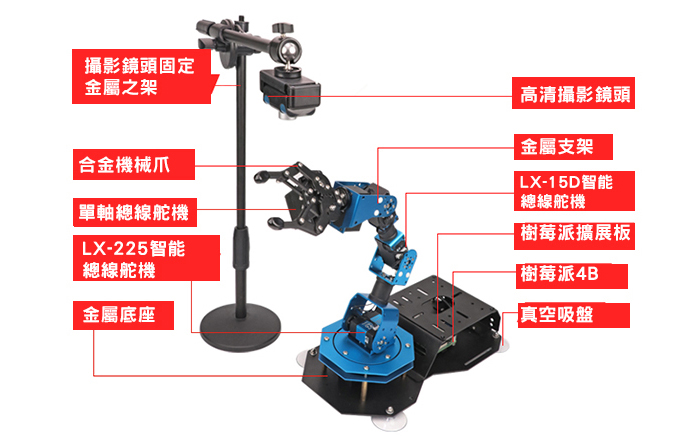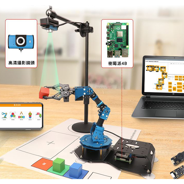Armpi 智能視覺機械臂以樹莓派4B為主要的控制核心,內有逆運動學算法,並配備了高清晰度攝影鏡頭,可以完成顏色分辨,語音控制等功能。可以透過Wifi影片控制機械手臂運動、提供手機APP控制機械手臂運動;採用高清攝像鏡頭,影片回傳至手機或者平板電腦;機械手臂採用全數字馬達,末端帶有堵轉保護,使用壽命長。