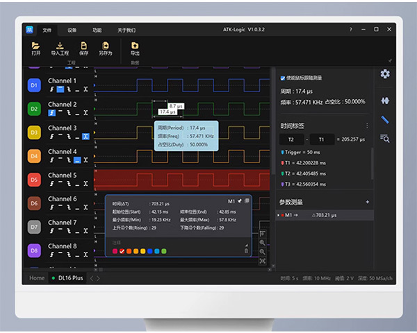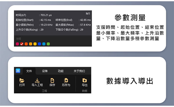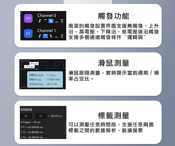 | 最大採樣深度-Buffer | 1G(bit)RLE硬體壓縮可有效提高採樣深度 |
