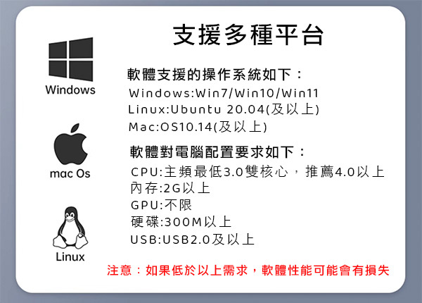 | 最大採樣深度-Stream | 低採樣率時,取決於電腦內存大小 |